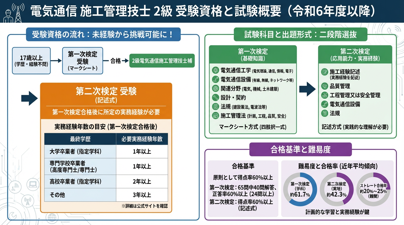 電気通信施工管理技士2級の資格取得を目指す上で、まず理解しておくべきは、その受験資格と試験の具体的な内容です。特に令和6年度(2024年度)からは受験資格が大きく変更されており、以前よりも多くの人が挑戦しやすくなっています。ここでは、最新の情報を基に、受験資格から試験の形式、そして合格基準までを詳しく解説します。