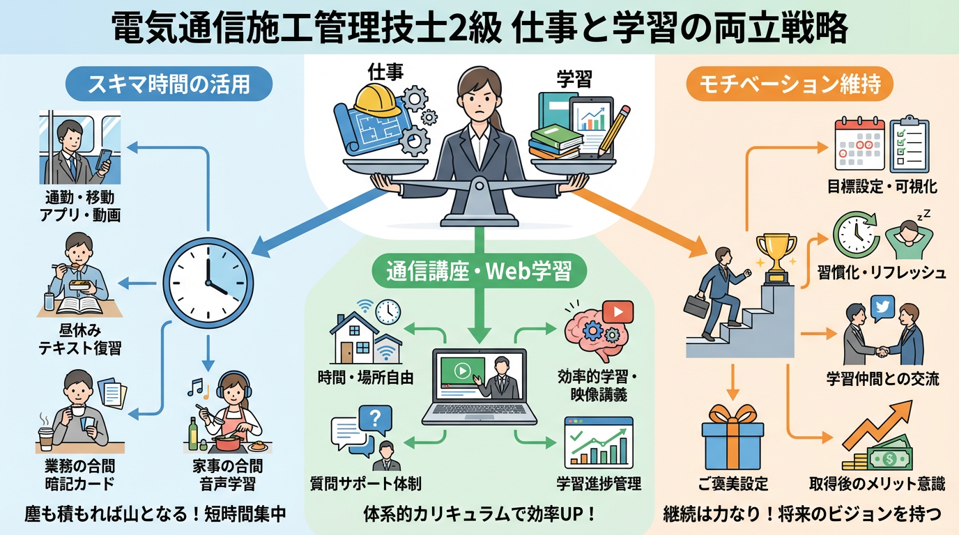 電気通信施工管理技士2級の資格取得を目指す社会人にとって、仕事と学習の両立は大きな課題です。しかし、適切な戦略と工夫を凝らすことで、多忙な日々の中でも着実に合格へと近づくことができます。ここでは、仕事と学習を両立させるための具体的な方法を解説します。