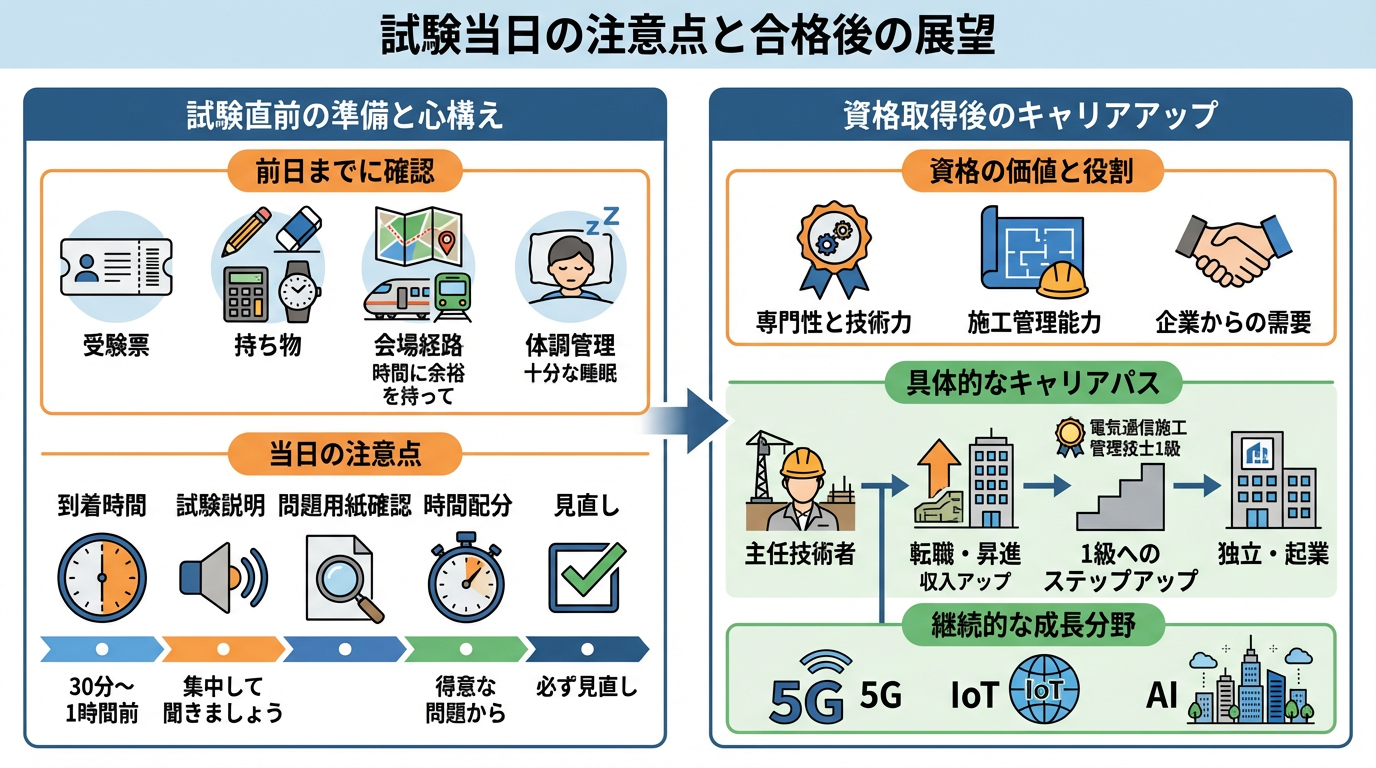 電気通信施工管理技士2級の試験当日は、これまでの学習の成果を最大限に発揮するための重要な日です。試験直前の準備と当日の心構えが合否を左右することも少なくありません。万全の体制で試験に臨めるよう、以下の点を確認しておきましょう。
