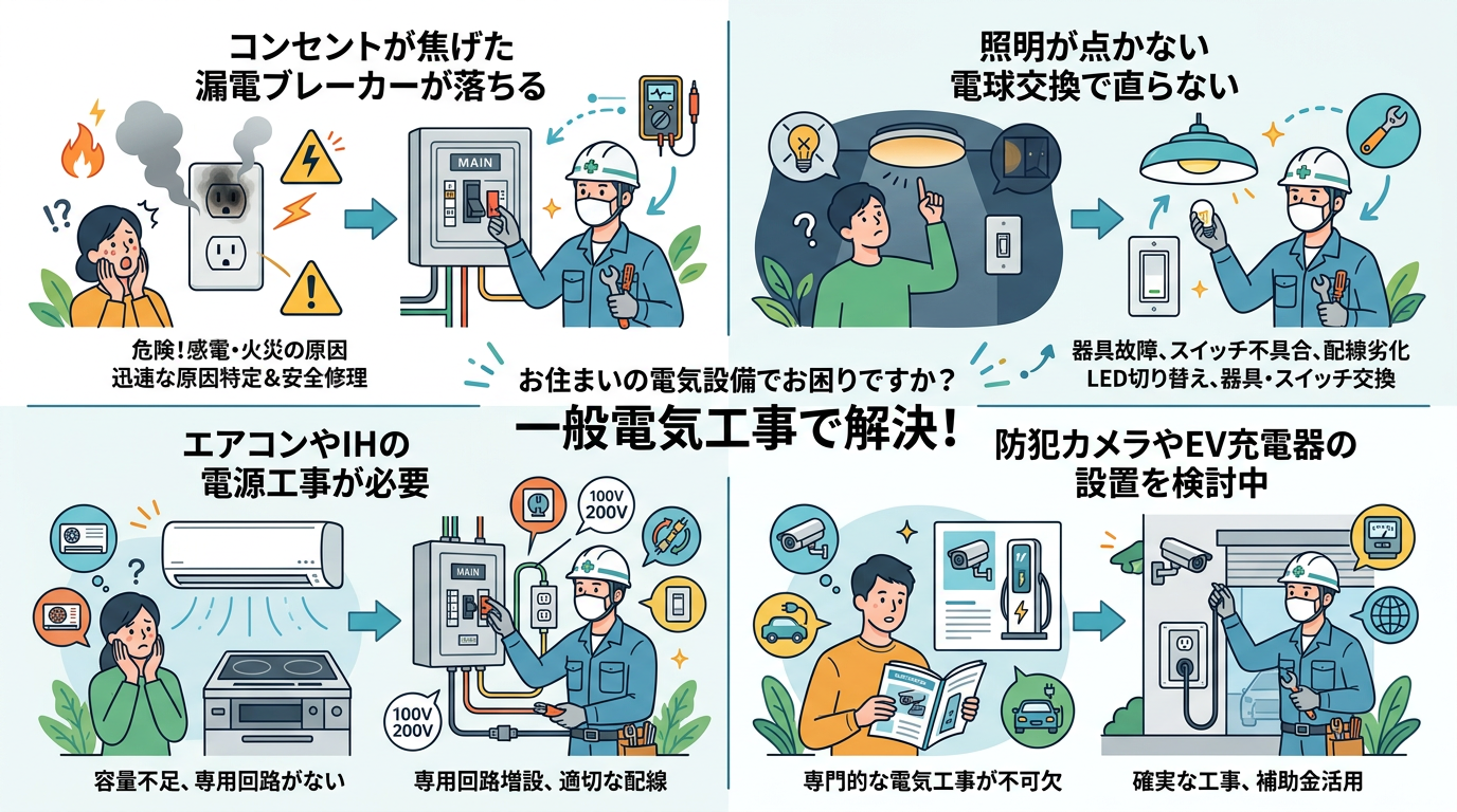 ご家庭やオフィスで発生する電気のトラブルは、日常生活や業務に大きな支障をきたし、時に危険を伴うこともあります。この記事では、「コンセントが焦げた」「漏電ブレーカーが落ちる」「照明が点かない」といった緊急性の高いトラブルから、エアコンやIHの電源工事、防犯カメラやEV充電器の設置まで、幅広い一般電気工事の解決策を解説。経験豊富な電気工事士が、深夜・早朝の緊急時にも迅速に対応し、安全かつ明瞭な料金で施工できる理由を詳しくご紹介します。この記事を読めば、電気のお困り事を安心して解決できる信頼できる電気工事業者を見つけ、依頼するまでの全てが分かります。