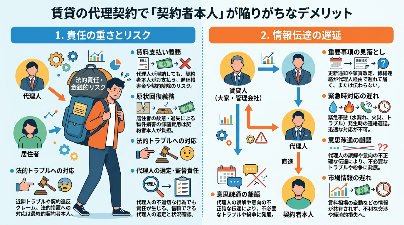 賃貸の代理契約は、多忙な方や遠方に住む方にとって便利な仕組みですが、契約者本人には見過ごせないデメリットが存在します。特に、契約の主体であるにもかかわらず、直接的なやり取りが少ないために生じる問題は多岐にわたります。ここでは、契約者本人が直面しやすい具体的なデメリットについて詳しく解説します。