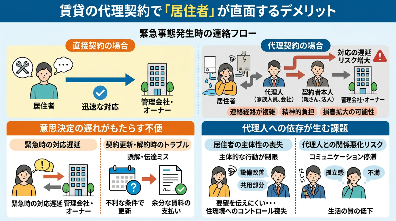 賃貸の代理契約は、契約者本人(多くの場合、親族や法人)がオーナーや管理会社と契約を結び、実際の居住者はその契約者の代理として物件に住む形態です。この契約形態は一見便利に見えますが、実際に物件に住む「居住者」にとっては、様々な不便やリスクが潜んでいます。直接契約ではないがゆえに生じる意思決定の遅れや、代理人への依存は、日々の生活の質を大きく左右する可能性があります。