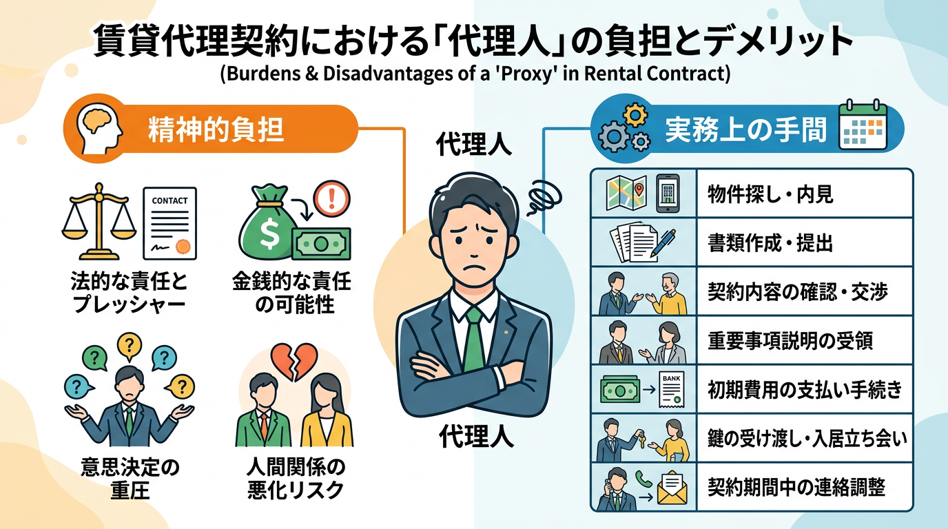 賃貸契約において代理人を立てることは、契約者本人や居住者にとってメリットがある一方で、代理人自身にも少なからず負担やデメリットが生じます。代理人は、契約者本人に代わって重要な役割を担うため、その責任は決して軽くありません。ここでは、代理人が直面する具体的な負担とデメリットについて詳しく解説します。