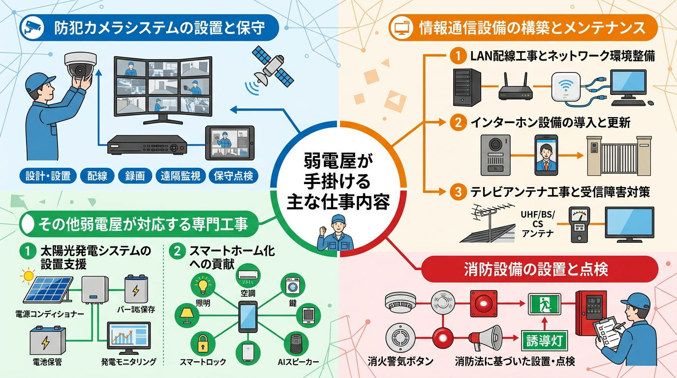 具体的には、情報通信、セキュリティ、放送などに関わる様々なシステムの構築を担っており、私たちの日常生活に不可欠なインターネット、電話、テレビ、防犯カメラ、インターホンといった設備の多くは、弱電屋の専門技術によって支えられています。