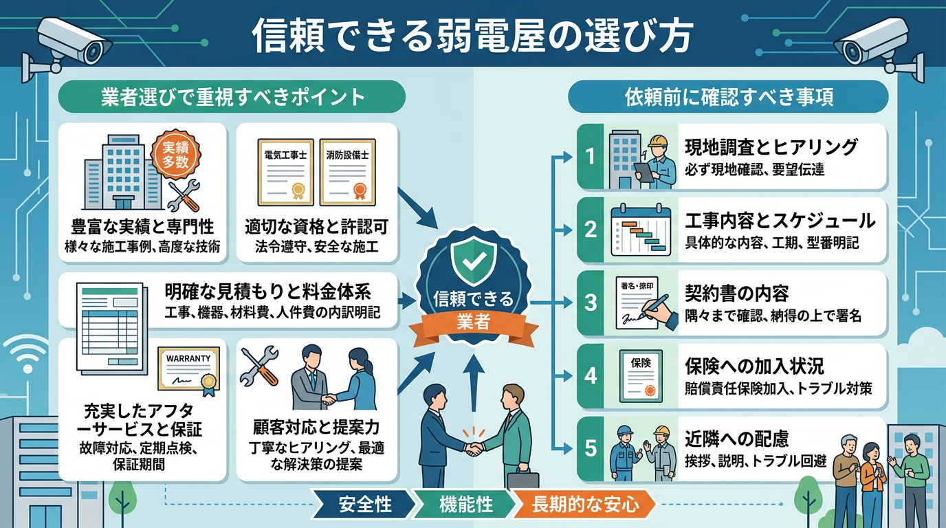 弱電屋を選ぶ際には、単に費用が安いという理由だけで決定せず、以下の多角的な視点から総合的に評価することが肝要です。