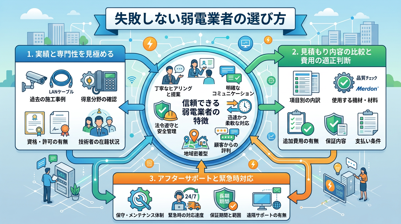 弱電工事は、ビジネスの効率性やセキュリティ、快適性に直結するため、業者選びは非常に重要です。ここでは、後悔しない弱電業者を選ぶための具体的なポイントを詳しく解説します。