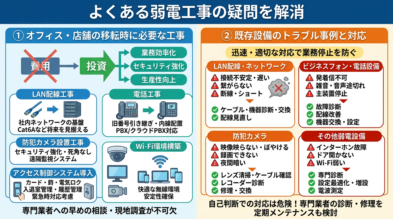 弱電工事は、オフィスや店舗の運営において不可欠なインフラを支えるため、様々な場面で疑問や課題が生じがちです。ここでは、特に多く寄せられる疑問とその解決策について詳しく解説します。